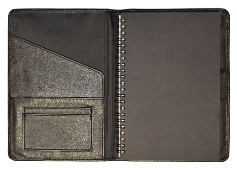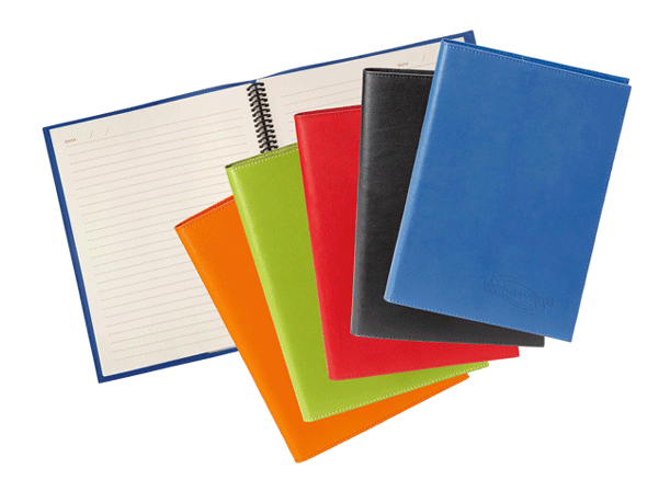 Bonded leather refillable journals. Spiral bound insert with 72 lined ivory sheets (100% recycled material). Pen loop.